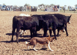 Rodney is no stranger to the Red Bluff Bull and Gelding Stockdog Trial in Red Bluff, California. He's been a regular competitor for many years, winning the Red Bluff Bull and Gelding Stockdog Trial in 1998 and 1999, again in 2001 with Harlan (Willie x Lena, a Hank daughter), and repeating it in 2002 with Pistol (son of Willie x Copper). |